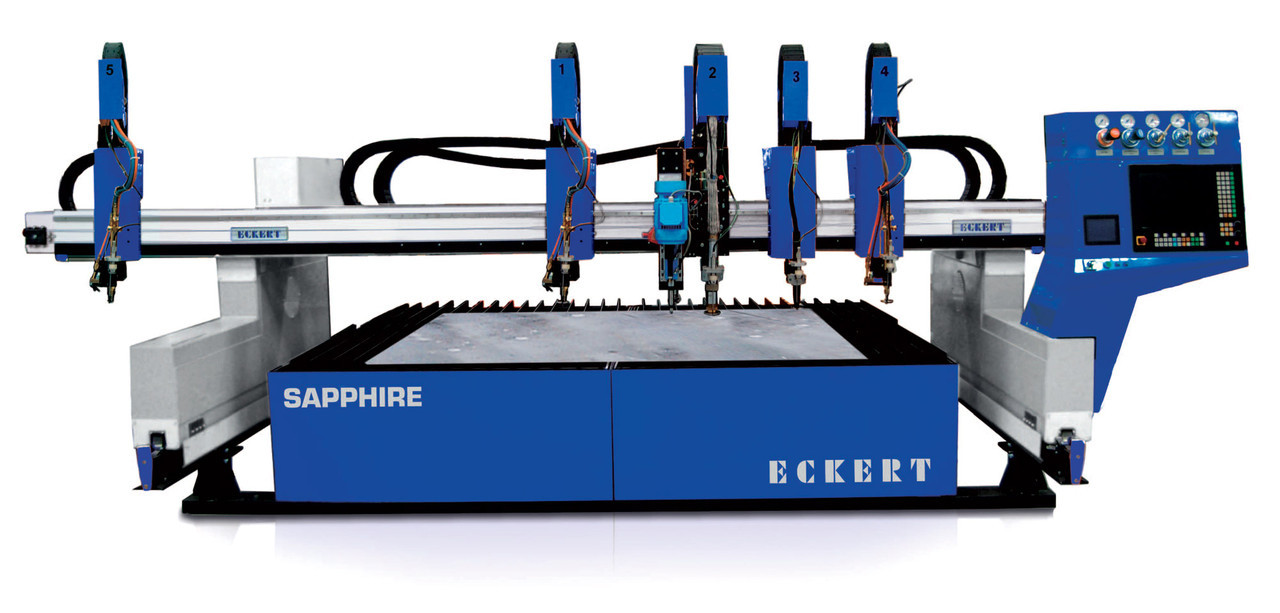 Управління порталу SAPPHIRE здійснюється за допомогою сучасного пульта у вигляді сенсорного екрана безпосередньо керуючого контролером. Система управління дозволяє використовувати ЧПУ. Комплектація машини SAPPHIRE з встановленою Flex Head 3D головкою дозволяє знімати фаски з заготівлі матеріалу і здійснювати підготовку фаски для майбутньої зварювання. Машина пройшла тривалу перевірку більш ніж в двохстах виробничих компаніях в найскладніших умовах важкої промисловості, суднобудівних верфей і металургійних підприємств. Установка SAPPHIRE компанії Eckert має широкий асортимент додаткового обладнання дозволяє як розширювати наявні можливості установки плазмового різання, так і додавати нові. Таким чином це дозволяє гнучко підібрати комплектацію машини, будь то збільшення довжини порталу або оснащення установки такими пристроями як позиціонери або супорти.